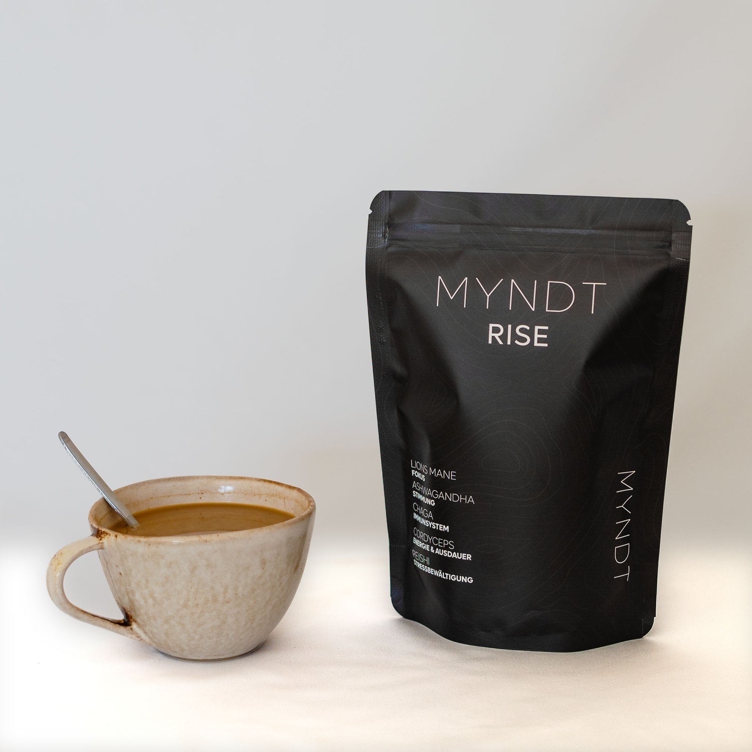 Inhaltsstoffe: MYNDT RISE Vitalpilz Mischung (Chaga, Reishi, Lions Mane, Cordyceps, Ashwagandha), Kakao, Masala Chai (Ingwer, Zimt, Nelke, Kardamom, Muskat), Kurkuma, Zimt.